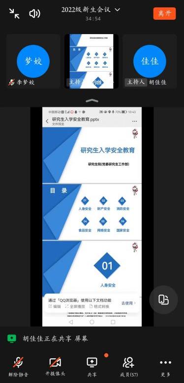 8月29日上午,食品学院开展了2022级研究生新生安全教育线上会议,辅导员胡佳佳及全体研究生新生参加。