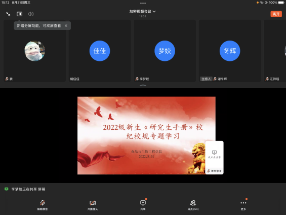 8月31日下午,食品学院举行了2022级研究生新生《研究生手册》学习大会,辅导员胡佳佳及全体研究生新生参加。