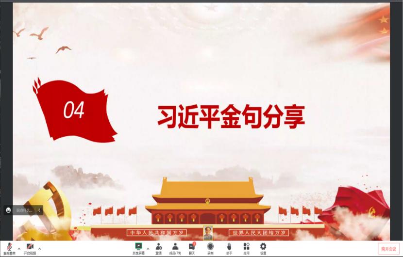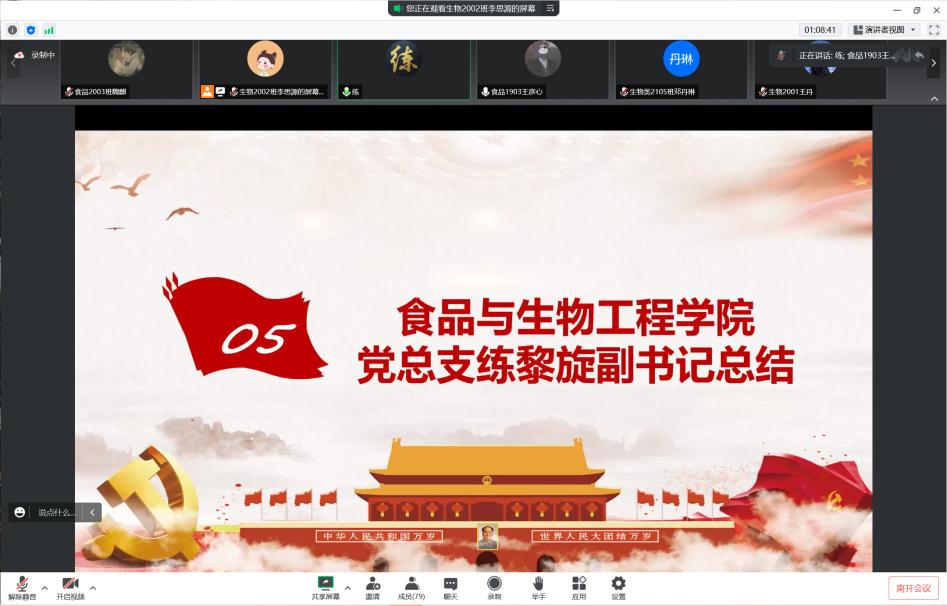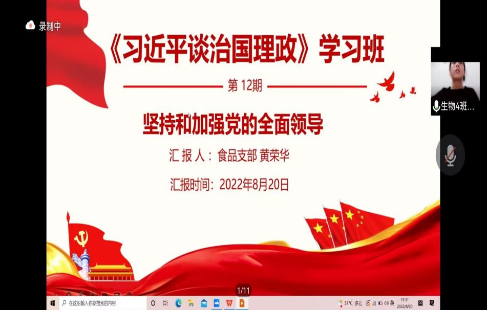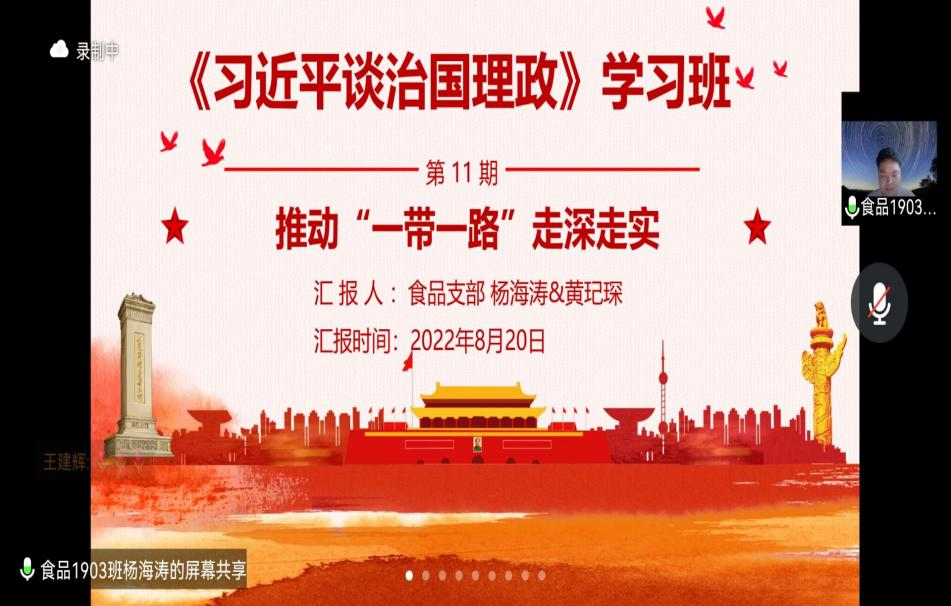 2022年8月20日,开云kaiyun体育食品与生物工程学院食品本科生党支部在腾讯会议举办《习近平谈治国理政》读书班第六次读书分享会。食品学院党总支书记王建辉、党总支副书记练黎旋、学工办老师胡佳佳等师生近100余人参加此次活动。
