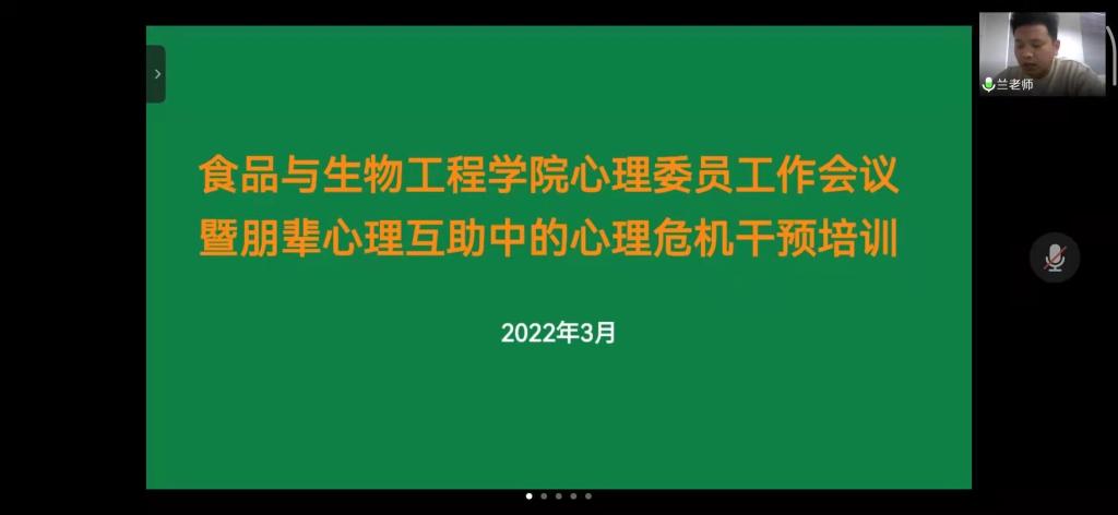3月29日下午,食品学院线上召开朋辈心理互助员培训暨心理委员工作会议,会议由学院心理辅导员兰贵辉老师主持,院学生会心理部学生干部、研究生心理工作负责人、学院全体心理委员参加。