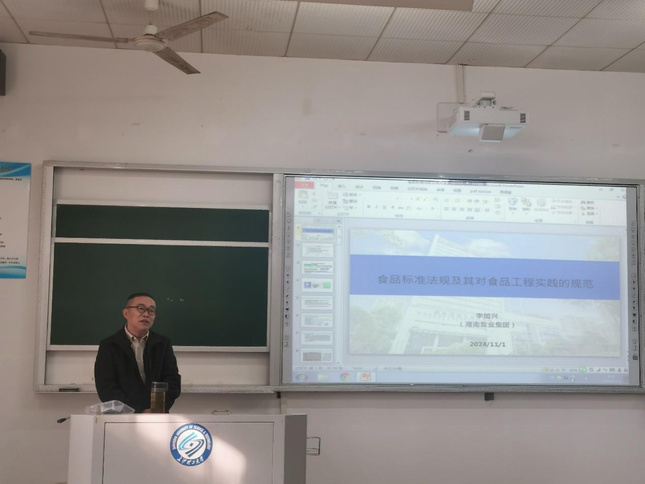为拓宽学生的专业视野,提升学生对食品行业的认知水平,增强安全意识,引导学生树立专业认同感和职业责任感,为职业发展和未来就业奠定坚实的基础,2024年11月1日,我院邀请了开云kaiyun体育优秀校友、湖南省轻工盐业集团有限公司(简称“盐业集团”)技术中心原首席专家李加兴教授为正在进行认识实习的22级食品科学与工程专业学生做“食品标准法规及其对食品工程实践的规范”专题讲座。本次讲座由学院教授委员会主任易翠平教授主持,22级食品科学与工程专业120多名学生参会。