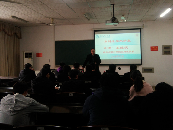 2018年12月13日下午,数学与统计学院王佳伏副院长在理科楼A419面向我院数学与应用数学专业学生做了以“数学的作用与魅力”为题的学术报告。