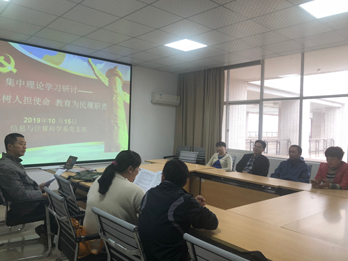 在“立德树人担使命,教育为民履职责”主题教育背景下,10月15日下午,信息与计算科学系在理科楼A502组织全系老师集中学习了《教育部关于深化本科教育教学改革全面提高人才培养质量的意见》。会议由支部书记兼系副主任李姣主持。