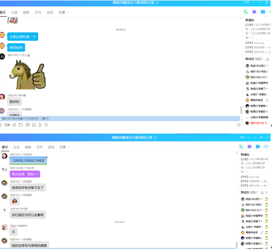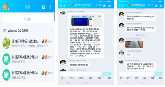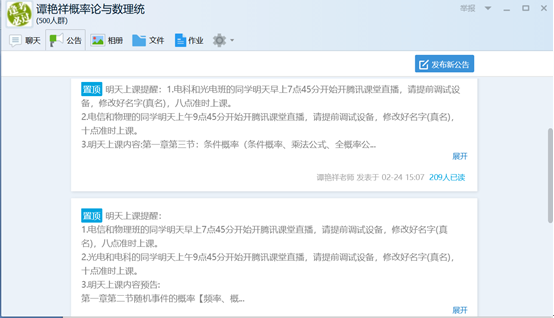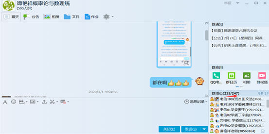 谭老师早在2月17日前就建立了“谭艳祥老师概率论与数理统计”QQ群,所教班级245名学生全部加入了课程,确保了网络教学实施方案及时通知到了每一名学生,为后续网络教学发布通知、网络答疑等奠定了基础。