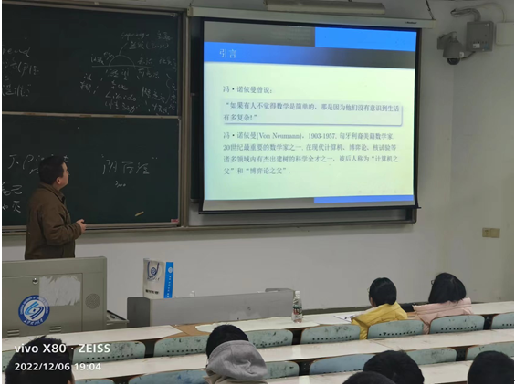 12月6日晚上19:00-21:00,数统学院在金盆岭校区6教107教室邀请学院王永威博士作了题为《数学公理化的认识与思考》的通识教育讲座。