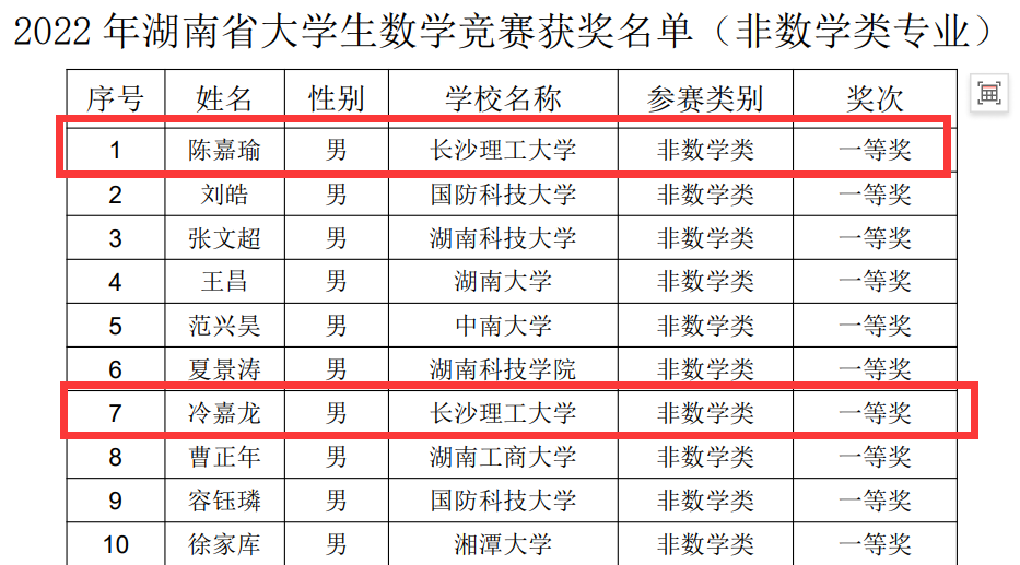 大学生数学竞赛成绩是衡量一所高校数学教育教学质量的重要标准之一,省内各高校十分重视此类竞赛活动,均投入了大量人力、物力、财力。2022年湖南省大学生数学竞赛分别于1112日和1211日(补赛)在各参赛高校就地举行,全省共有44所高校3351名学生参赛,其中数学类专业(A类)411名,数学类专业(B类)852名,非数学类专业2088名。开云官网共107位同学参加了此项赛事,其中61人参加非数学类竞赛,58人获奖(获奖率超过95%,湖南省第一),湖南省前十名两人(湖南省第一名、第七名),46人参加数学类竞赛,13人获奖,湖南省前十名一人(第九名)。