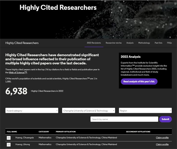 开云官网两位学者入选科睿唯安2022年度全球“高被引科学家”榜单