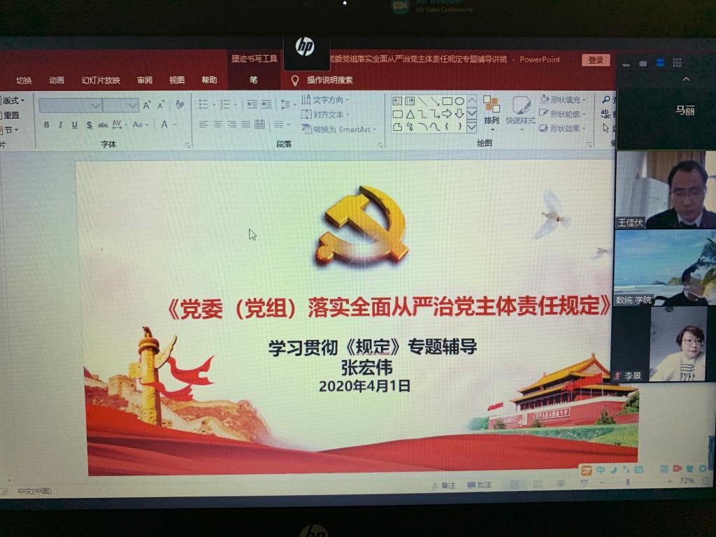 4月1日下午,学院党委组织本年度线上中心组第二次专题学习,学习《党委(党组)落实全面从严治党主体责任规定》、学习习近平总书记关于疫情防控工作重要讲话。学院领导班子全体成员参加了学习,院党委书记张宏伟主持会议并做要求讲话。