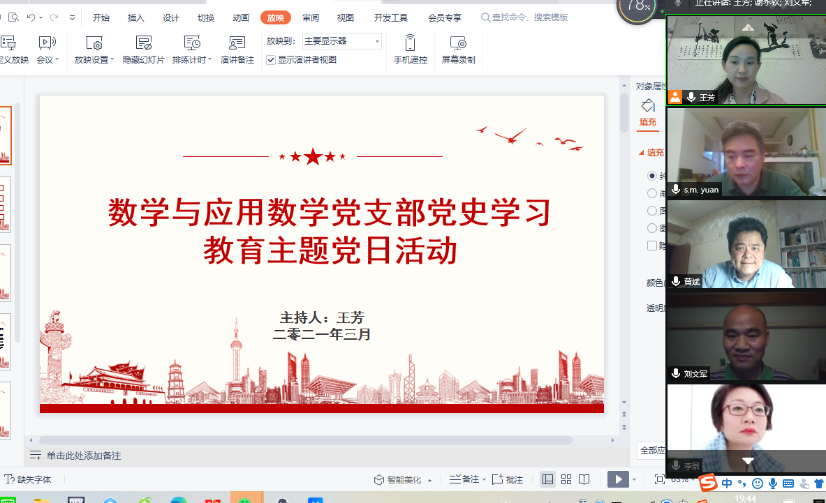 根据学校、学院党委关于开展党史学习教育第一次专题学习相关要求,数学与应用数学党支部在支部书记王芳的认真组织下,紧紧围绕“学史明理”主题,分别于2021年3月23日、3月29日开展了党史学习教育第一次专题学习,此两次学习均利用腾讯会议软件采取线上学习的形式,学习内容主要包括《共产党人》发刊词、新民主主义论、改造我们的学习、 如何研究中共党史、对《关于若干历史问题的决议》草案的说明、在纪念毛泽东同志诞辰一百二十周年座谈会上的讲话、在纪念邓小平同志诞辰一百一十周年座谈会上的讲话等等,学习后支部党员展开了激烈的讨论,支部书记王芳认为这次专题学习是学史增信、学史崇德、学史力行的基础,只有“明理”,才能更加深刻明白“我们从哪里来、现在在哪里、还要往哪里去”,才能更加清晰理解“我是谁,为了谁,依靠谁”。支部李景副院长认为要准确把握“学史明理”的深刻内涵,不断从党的光辉历史中汲取砥砺奋进的力量。支部王佳伏副院长认为要从党史学习中求真理、悟原理,切实增强用当代中国马克思主义武装头脑的政治自觉。支部老党员万勇教授认为从党史学习中悟初心、明使命,奋力投身为人民谋幸福、为民族谋复兴的伟大实践。