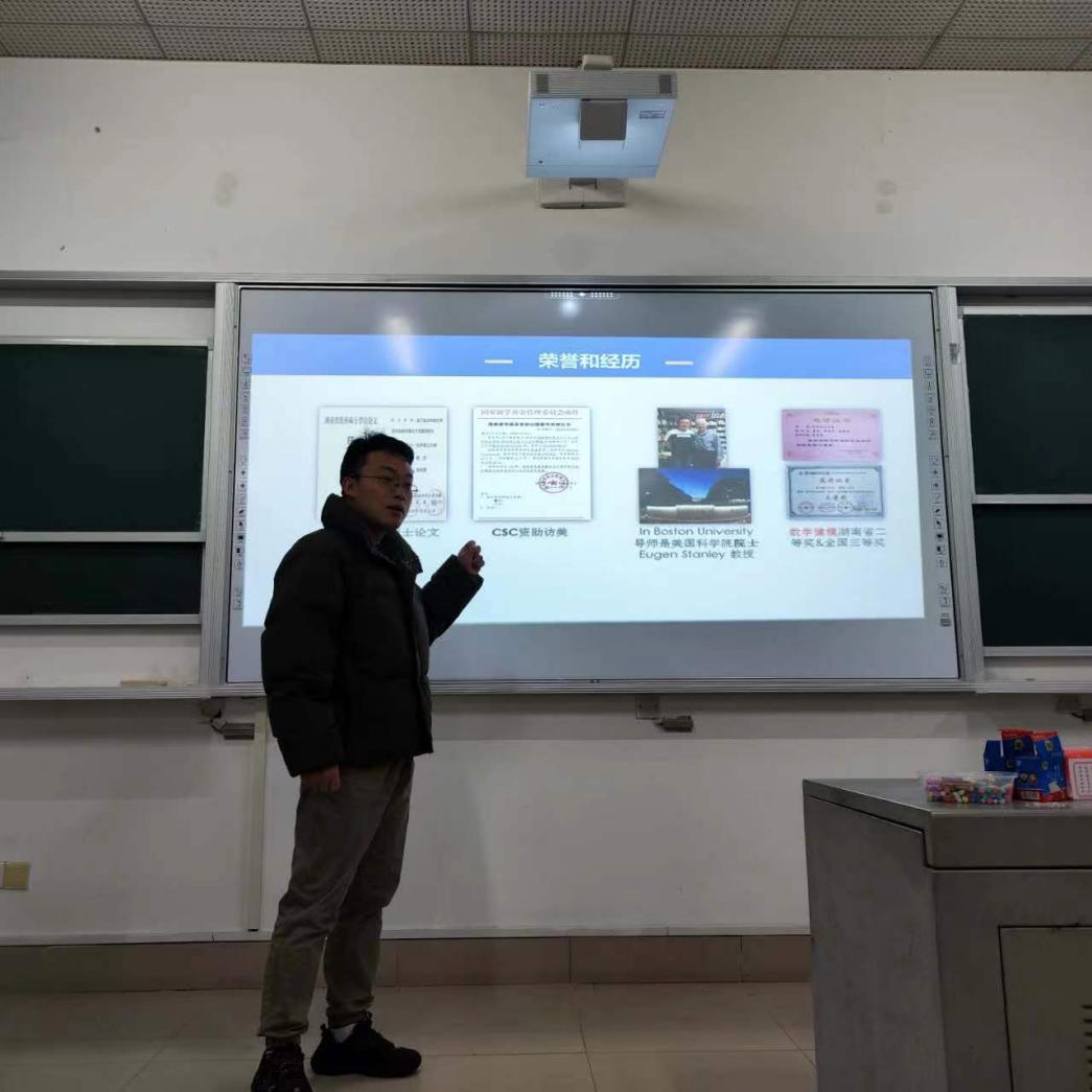 首先,曹杰老师向与会同学们详细介绍了统计学专业。接着,曹老师从金融危机和系统性风险有关的统计分析入手,解释了系统性风险的产生和扩散,并介绍了如何用复杂网络理论研究系统性风险。