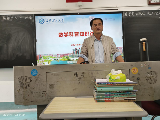 为提高学生学习数学的兴趣,感悟数学的奥秘,数统学院于11月2日到株洲市二中开展数学科普知识讲座。学院公共数学系主任谭艳祥老师应邀为高二11班学生授课。