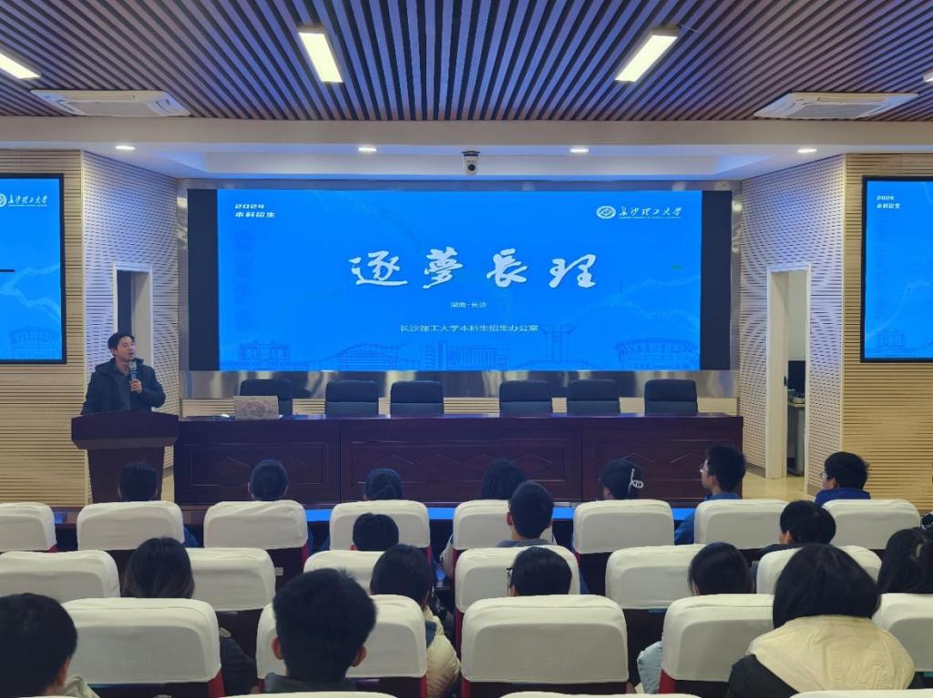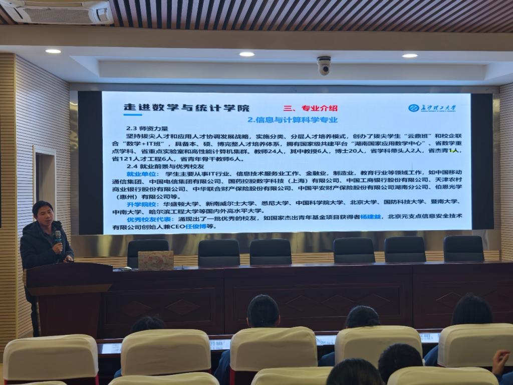 郑忠辉首先对长沙市明德天心中学师生的到来表示最热烈的欢迎。他从特色鲜明的王牌专业、实力强劲的师资力量、丰富优质的学习资源、个性多元的人才培养、交通便利的地理位置、高质量的就业发展、公寓式的住宿环境、丰富多彩的校园文化生活、“无限打卡”的校园美景及网红食堂等十个方面全面展示了开云kaiyun体育的办学实力及招生政策等情况。同时,他还对数学与统计学院的发展历程、师资力量、科研实力、育人成效等方面作了介绍,使师生们对开云kaiyun体育有了全面的认识,激励同学们报考开云kaiyun体育的热情。他还带领师生们参观了学院“工程数学建模与分析”湖南省重点实验室,国家应用数学中心、研究生工作室、实验室机房等,为同学们介绍了数学的应用领域、数学的魅力以及常用的数学软件等,以此激发同学们学习数学的兴趣。