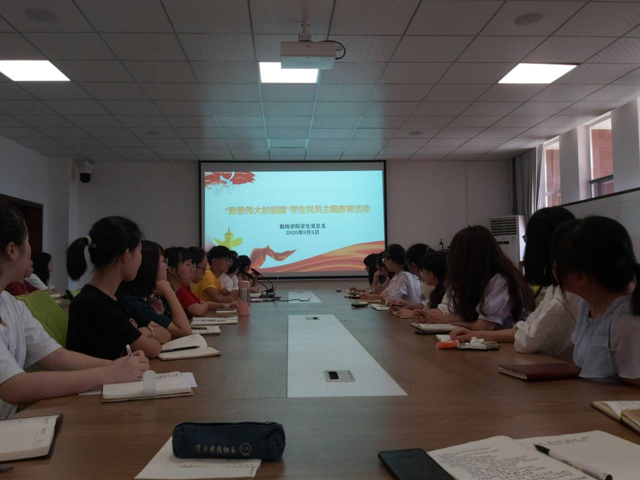 2020年9月3日是中国人民抗日战争暨世界反法西斯战争胜利75周年纪念日,为缅怀先烈、致敬伟大的祖国,数统学院学生党总支在理科楼A212集体观看向抗战烈士敬献花篮仪式现场直播视频,并开展座谈会。