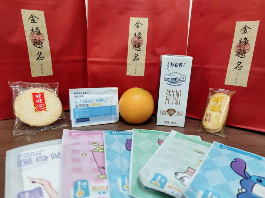 考研慰问礼包中有暖身贴、牛奶、旺旺仙贝、旺旺雪米饼、橙子以及酒精消毒棉片;健康礼包有口罩、连花清瘟颗粒、小柴胡颗粒等。一件件贴心的礼物,句句真切的话语,都是学院对考研学子最真挚的关爱与祝福,希望考研学生都能牛气冲天,运气旺旺,“橙”功上岸,金榜题名,一战成硕。