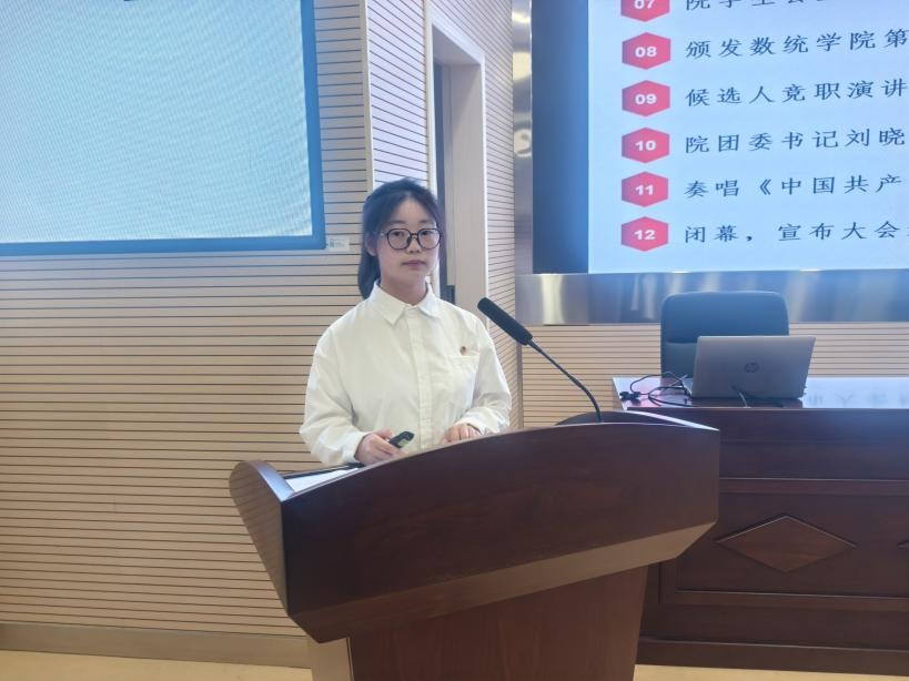 紧接着院主席团成员王雪芹,院团委副书记马欣宇分别做《筹备工作报告》《代表与候选人资格审查报告》和《选举办法》,随后宣布监、计票人建议名单并提请大会通过。院主席团成员单思敏做《全年工作报告》并颁发数统学院第十六届团委、学生会聘书。