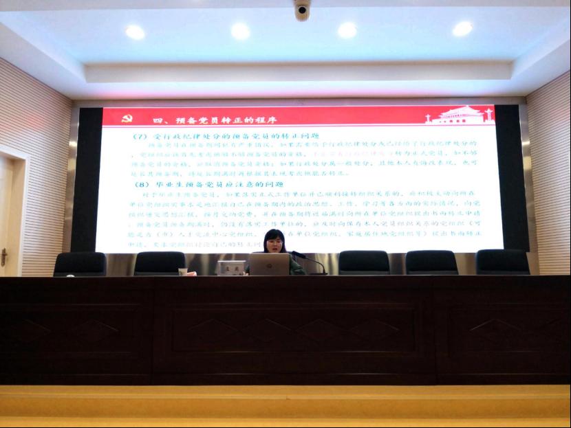 开班仪式后,学生党建辅导员庄奕带来了《预备党员如何度过预备期》主题党课。庄奕从预备期的必要性、党员的教育管理、预备党员在预备期需注意的问题、预备党员转正的程序四个方面对预备党员如何过好预备期进行了详细阐述,并通过身边的实例生动地讲解枯燥的理论知识,融入自己的心得体会,使进入预备期的预备党员们在思想上及认识上对预备期有了更准确的认识。