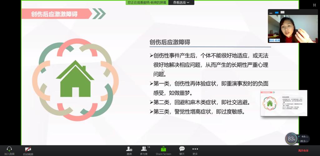 杨爽讲解了创伤后应激障碍”。她指出重大事件发生时常见的是应激反应,而在事件发生之后,却有一种常见的严重心理问题,即创伤后应激障碍。在详细分析创伤后应激障碍的概念和类别之后,杨爽从当事人”和“旁观者”两个角度分别分析了如何判断是否患“创伤后应激障碍”。同时她结合案例,向心委们强调,要做一个“有心人”,敏锐的觉察他人、觉察自己,适时提供帮助,“我们也许没有办法真正的做到感同身受,但是一定要努力做到‘与他同在’,当下认真倾听,给予对方反馈和支持,让他感受到你的真诚、关心和理解”。