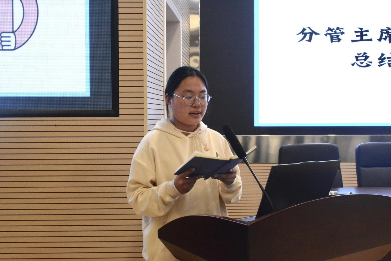 会议第二项议程,刘晓丹作总结发言。她指出,发现问题仅仅是第一步,更为关键的是要深入思考解决问题的方法与策略,鼓励各部门积极探索创新,群策群力攻克难题。接着,刘晓丹围绕“成长”这一主题进行了全面总结,她对全体干部在过去一学期的工作成长给予了充分肯定,高度赞扬了他们在工作中展现出的积极态度与进取精神。同时,也就工作中存在的不足之处给出了建议,殷切期望全体成员能够正视问题,持续努力,不断实现自我突破与成长。