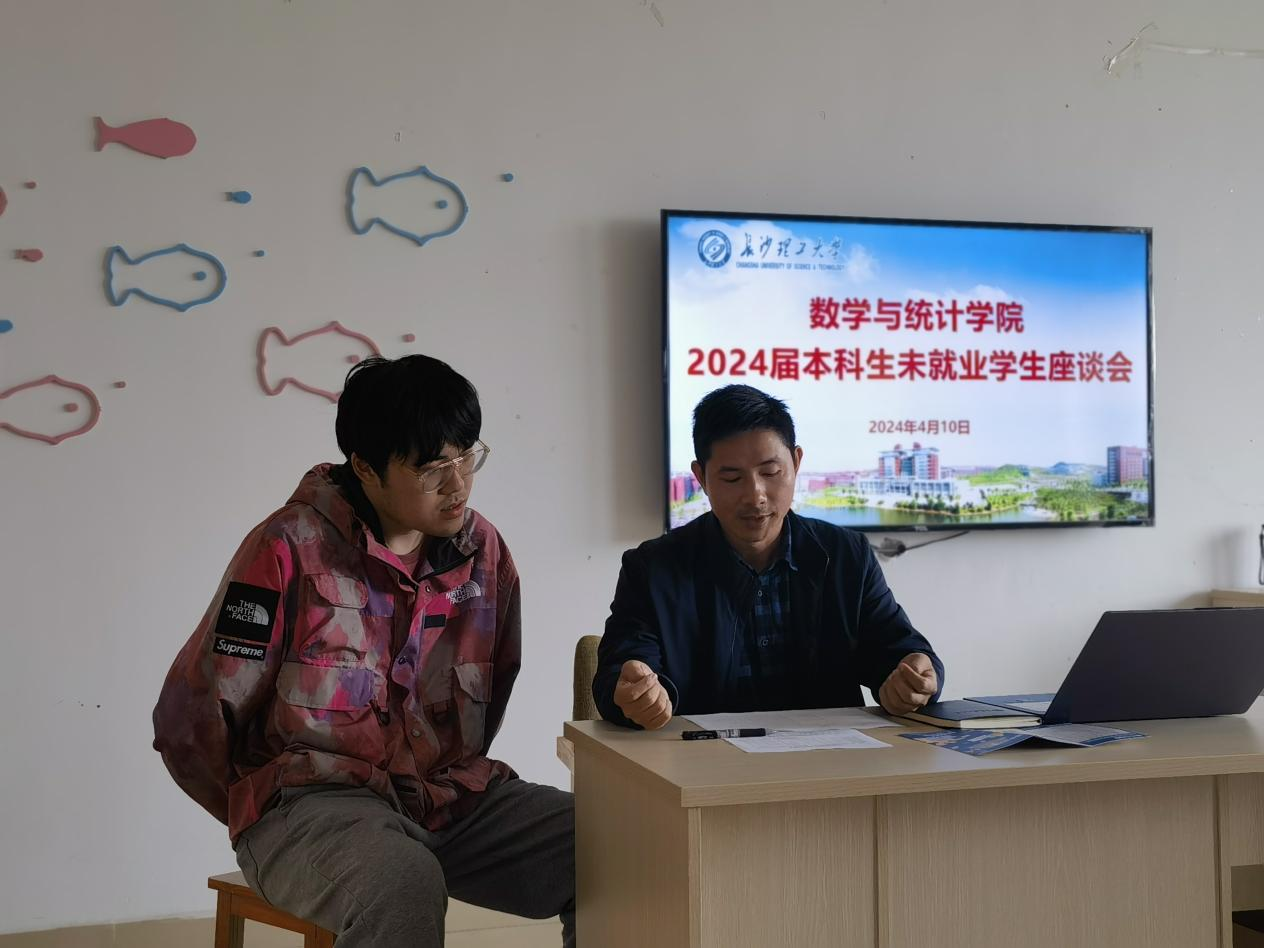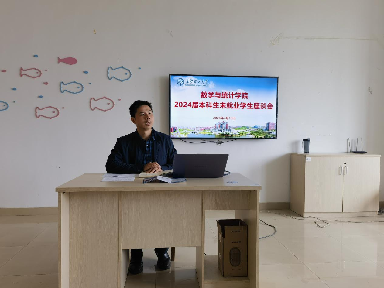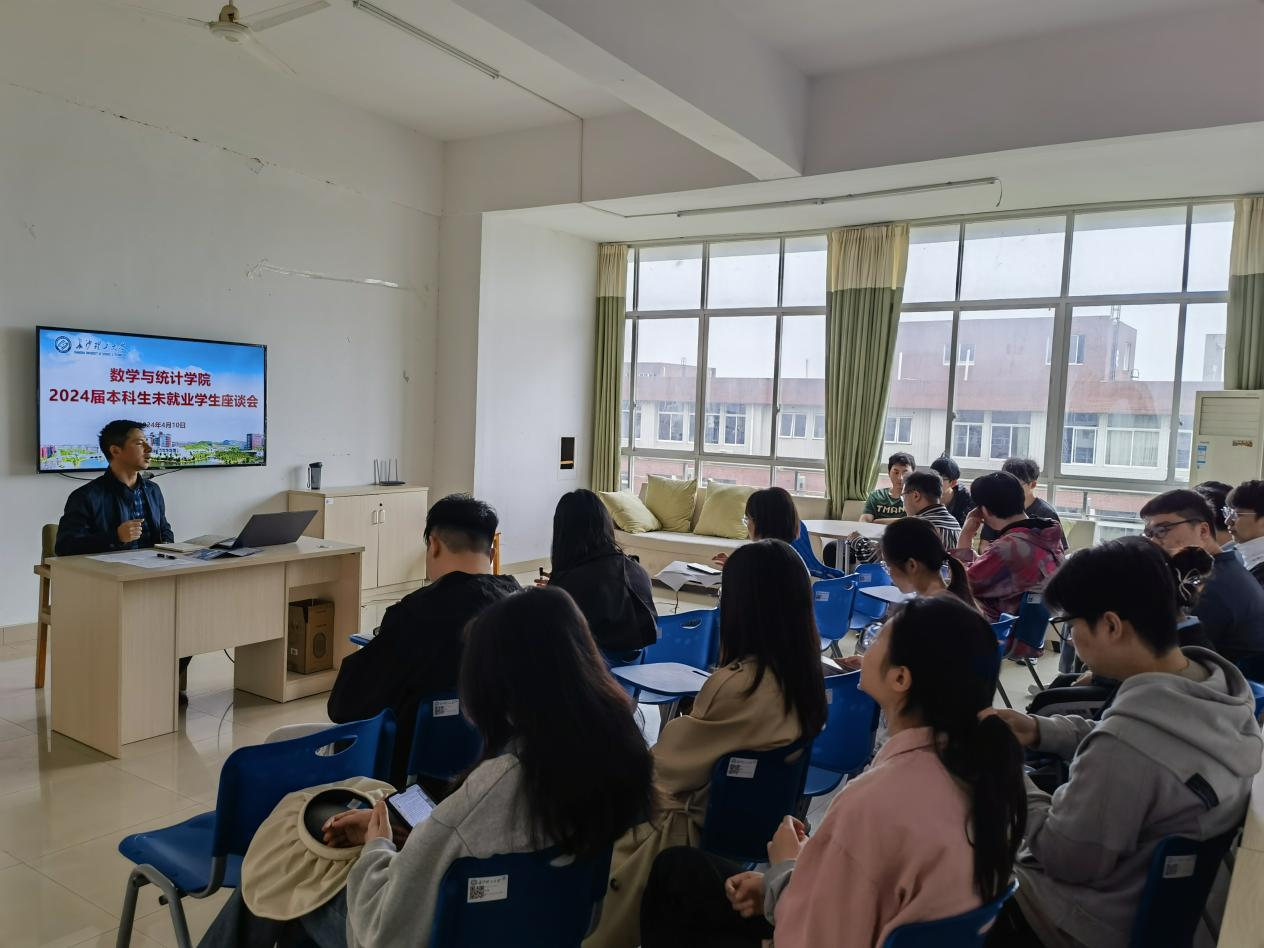 4月10日上午,数学与统计学院在理科楼A510举行2024届本科毕业生未就业学生座谈会,学院党委副书记兼副院长郑忠辉出席,本科毕业生辅导员刘晓丹、就业学生代表参加,会议由学工办辅导员彭峥主持。