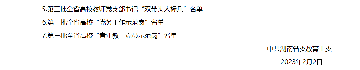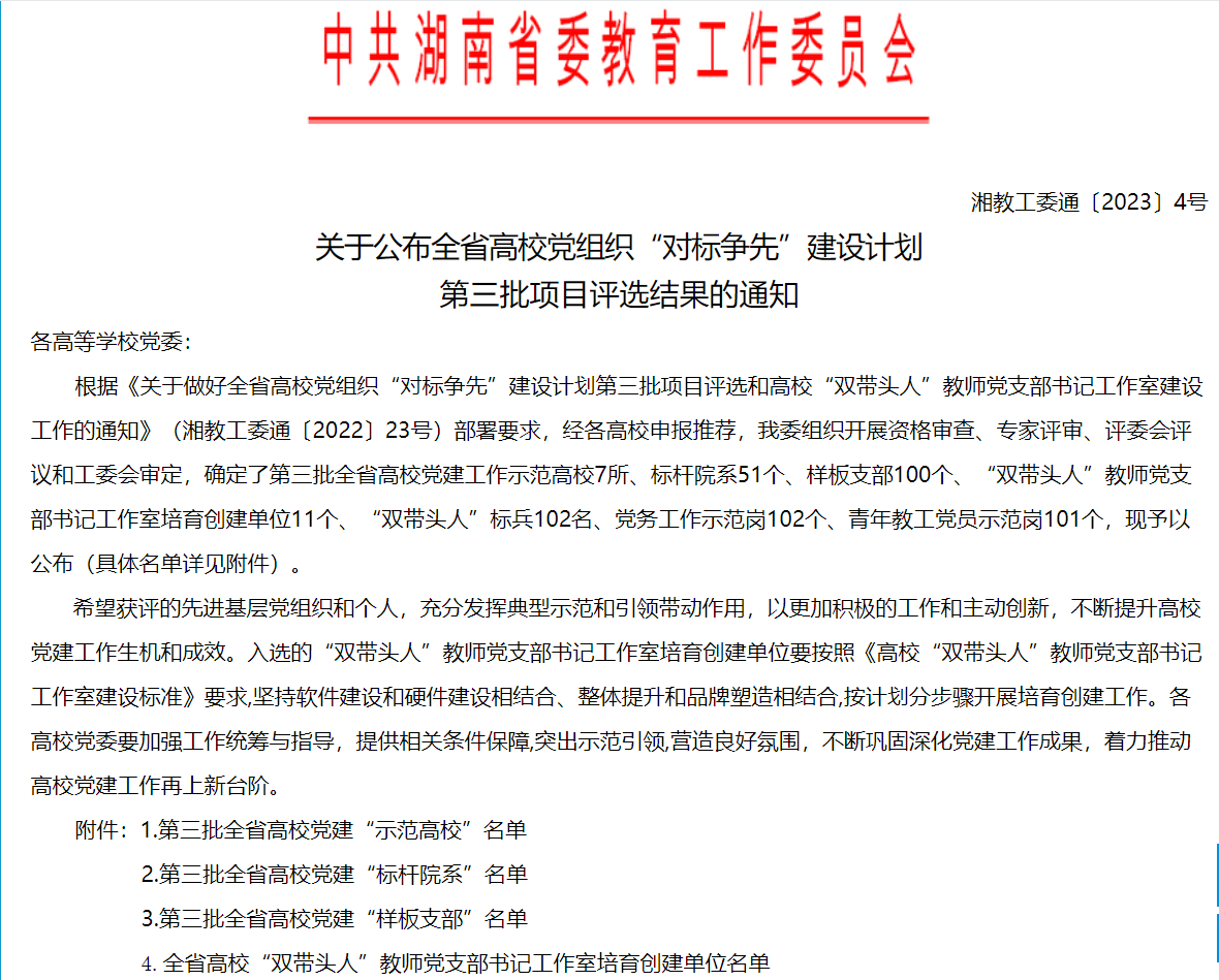 2月6日,中共湖南省委教育工委发布通知公告——《关于公布全省高校党组织“对标争先”建设计划第三批项目评选结果的通知》(湘教工委通〔2023〕4号),开云kaiyun体育土木工程学院获评第三批全省高校党建“标杆院系”。