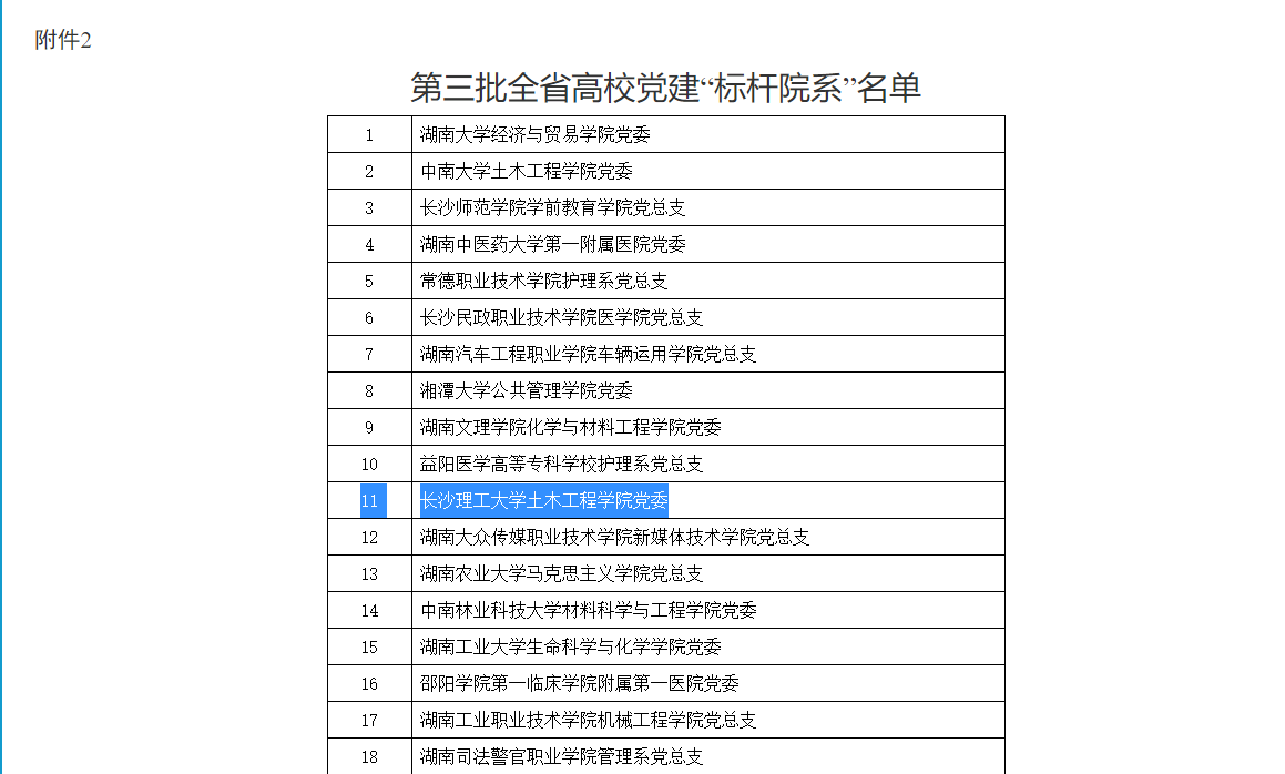 2022年12月,根据湖南省委教育工委发布的《关于做好全省高校党组织“对标争先”建设计划第三批项目评选和高校“双带头人”教师党支部书记工作室建设工作的通知》(湘教工委通〔2022〕23号)部署要求,土木工程学院党委积极申报,经学校评审推荐,中共湖南省委教育工委资格审查、专家评审、评委会评议和工委会审定,确定了第三批全省高校党建工作示范高校7所、标杆院系51个、样板支部100个、“双带头人”教师党支部书记工作室培育创建单位11个、“双带头人”标兵102名、党务工作示范岗102个、青年教工党员示范岗101个。
