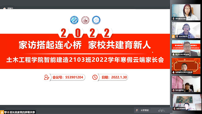 李小军首先对会议的目的进行了说明,着重强调了家庭教育和家校共建的重要性。希望进一步加强家校合作,携手共建和谐的家校育人共同体。大家集中观看了《2021 我们在一起》班级总结视频。班长吴家亮作了《智能建造2103班第一学期工作报告》,从学习竞赛、班级活动、文体实践、班级荣誉等方面进行了全面汇报,总结回顾了本学期班级活动及获得的相关荣誉。邓文杰从年级层面的日常表现与家长们进行了交流互动。他从学习方面进行了横向与纵向对比,指出班级归属感对学风建设的重要性。同时,对寒假期间的具体事项进行了安排。他强调,假期实现是弯道超车的最好机会,希望各位家长在确保安全的前提下,督促同学充实寒假生活。最后,李小军从中国式家长存在的“上了大学,家长就轻松了”等认知误区切入主题,围绕“如何做一名合格的大学生家长”作了分享交流。他指出,本科阶段是青年成长成才的关键阶段,只有全方面的发展才能为今后的事业奠定坚实的基础。他强调,大学生家长应该多陪伴,多沟通,努力成为大学生愿意倾述的对象和学习的榜样。同时,他也希望加强家校合作,统一思想,互通有无,协同做好育人工作。