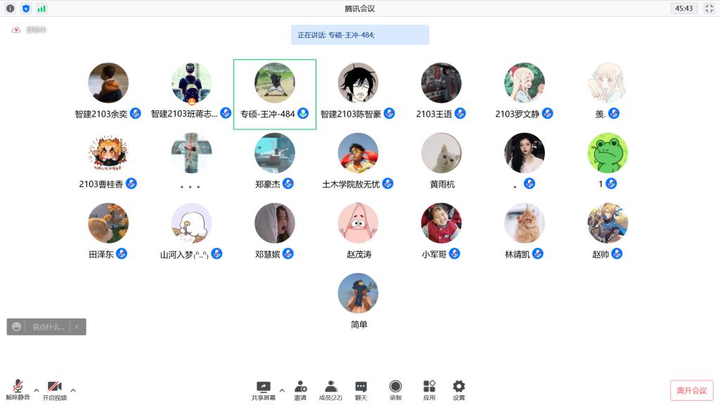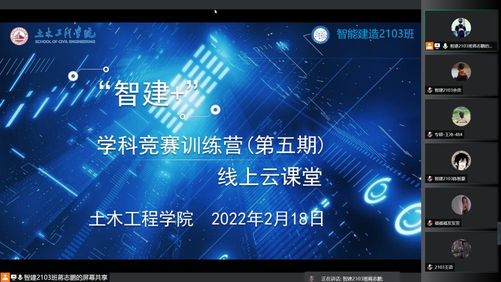 为进一步营造优良学风,培养学科竞赛后备人才,加深学生对中国国际“互联网+”大学生创新创业大赛的了解,2月18日晚,土木工程学院智能建造2103班开展“智建+”学科竞赛训练营第五期线上云堂课并圆满结束。中国国际“互联网+”大学生创新创业大赛省赛二等奖获得者王冲应邀主讲。智能建造2103班班主任李小军老师,下班干部田泽东及来自全院20余位学员参加培训,班级团支书蒋志鹏主持会议。