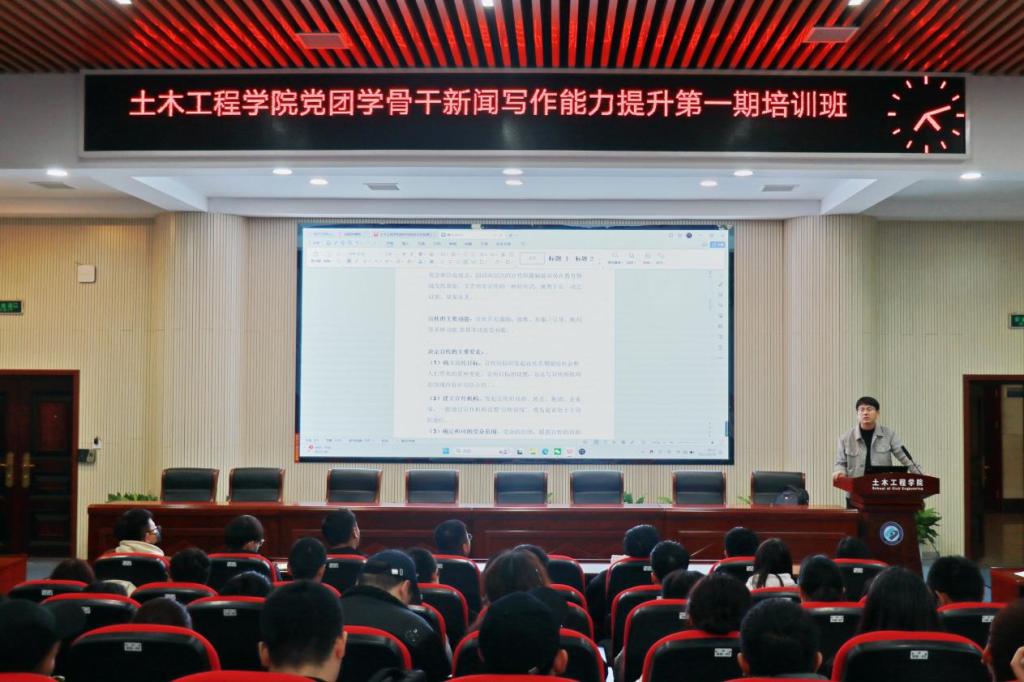 为进一步提升党团学学生骨干新闻写作能力,11月14日下午,土木工程学院学生党建中心在工科二号楼B302报告厅举行新闻写作能力提升第一期培训会,电气学院辅导员黄文韬老师应邀主讲,培训会由学生党建中心易远翔主持。