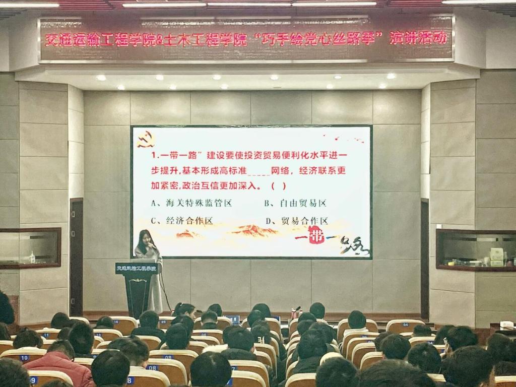 为弘扬丝路精神,鼓励同学们不忘初心,争做堪当民族复兴重任的时代新人。12月20日,“巧手绘党心丝路季”活动于工二B301会议室进行作品演讲。交通工程学院党委副书记涂道勇、交通工程学院党建辅导员肖敏强、交通工程学院研究生辅导员周浩受邀出任评委、土木工程学院党建辅导员刘文成,140余名同学观众到场。本次演讲活动由土木学院罗滔、交通学院曾钰莹主持。