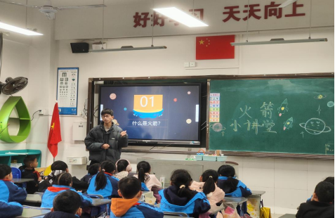 课堂上,大学生志愿者们通过PPT展示,深入浅出地向小朋友们依次讲解了火箭的类型、升空的原理、发展历程、用途与成就,重点讲述了中国火箭的梦想和水火箭升空的原理与制作步骤。课堂通过问题回答、游戏互动等寓教于乐的形式,让小朋友积极参与其中。