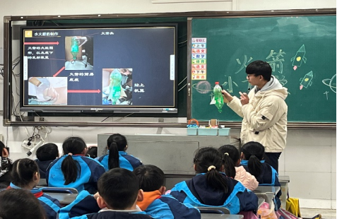 近日,土木学院工程力学专业学生党员志愿者在力学系主任彭旭龙师的带领下,走进龙湾小学开设火箭科普小课堂,并与小朋友共同见证了水火箭的成功发射。