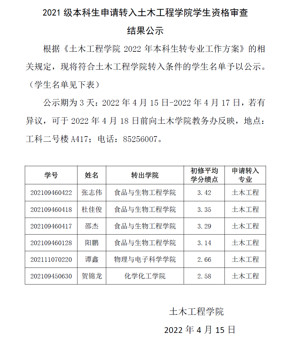 2021级本科生申请转入土木工程学院学生资格审查结果公示