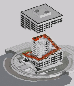 将竖向交通尽力解决在中心部分,四周向外挑出大概8米左右,拥有全方位的视野效果。