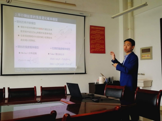 鲁博士首先介绍了拉吊索桥梁腐蚀与疲劳损伤问题的起源及换索成本问题等研究背景,并从拉索腐蚀的空间随机性、时变性、体系性等特征说明了开展斜拉桥体系可靠度评估的重要性;接着,从平行钢丝索强度退化概率模型斜拉桥时变体系可靠度的高效分析方法斜拉桥体系可靠度分析实例等三个方面汇报了自己的研究进展。