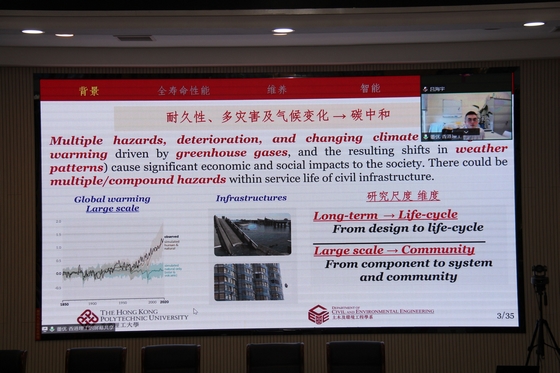 董优以“基础设施全寿命与智能维养”为题,从结构服役全寿命过程出发,介绍了结构体系及基础设施群的性能演变规律、人工智能在结构维养中的应用、各类灾害和环境载荷发生的差异特性及关联特征。另外,基于实际监测数据和物理计算模型,结合人工智能算法,他介绍了物理准则与数据信息混合驱动的智能维养系统的建立方法,为降低结构维养过程中材料使用量、维修费用及碳排放量等提供了参考。