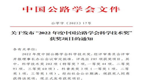 据悉,中国公路学会科学技术奖设立于2002年,每年度评选一次,作为国家科技奖励体系的重要组成部分,目前该奖项已成为我国公路交通行业规格最高、最具权威、最有影响力的科技奖项。“十四五”期间,我院将继续贯彻落实国家实施创新驱动、交通强国的发展战略,在学校的科学部署和技术支持下,切实发挥产学研平台作用,加强对科技成果的宣传、推广和转化。