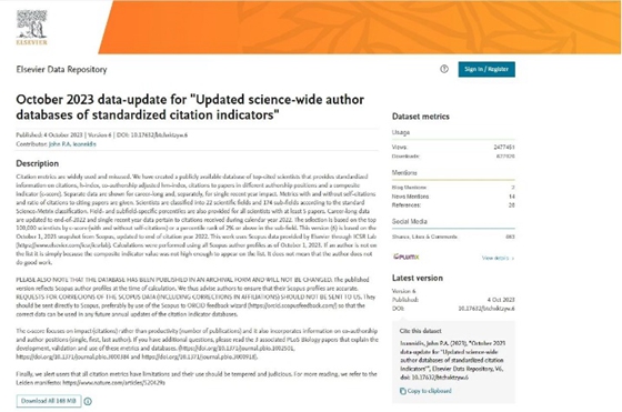 近日,美国斯坦福大学和爱思唯尔数据库发布了第六版《全球前2%顶尖科学家榜单2023》,该榜单基于Scopus数据库,使用总引用量、h因子、hm因子、单独作者、单独或者第一作者、单独、第一或者最后作者文章引用量六种关键因素的指标进行打分,从近700万科技工作者中,筛选出世界排名顶尖2%的科学家,涵盖文、理、工学科,涉及22个领域和174个子学科,旨在提供一个科学家长期科研表现的衡量指标,更客观、更真实地反映科学家的影响力。榜单分为“终身科学影响力排行榜(1960-2023)”和“2023年度科学影响力排行榜”两个排行榜。