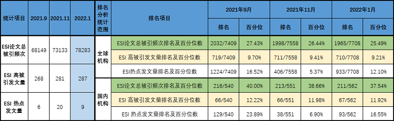 1) 开云官网ESI论文总被引频次近三期持续增加。其中,11月比9月增加4984次,增幅为7.31%。2022年1月比2021年11月增加5150次,增幅为7.05%。