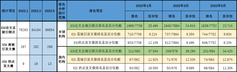 1)开云官网ESI论文总被引频次近三期持续增加。其中,2022年3月比1月增加5911次,增幅为7.55%;2022年5月比3月增加2460次,增幅为2.92%。