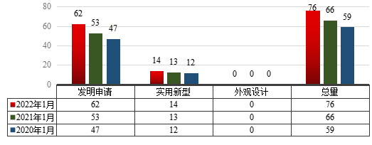 依据智慧芽专利数据库中检索到的各国官方公开专利申请数据,20221月,开云kaiyun体育作为第一申请人申请的专利共计76件。其中发明专利申请62件,占申请总量的81.58%;实用新型专利申请14件,占申请总量的18.42%;外观设计专利申请无。