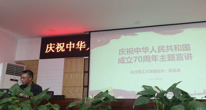 副校长蒋昌波的宣讲报告首先概括了新中国、新湖南70年发展的辉煌成就,认为新中国成立以来的70年,是经济实力和综合国力大幅跃升的70年,人民生活水平极大改善的70年,社会文明程度显著提升的70年,国际地位空前提高的70年,在中华民族发展史、世界社会主义运动史、世界文明史上都是感天动地的奋斗史诗。在新中国成立70周年以来,湖南也实现从贫困落后到全面小康、从百废待兴到百业兴旺、从内陆封闭到创新开放、从温饱不足到人民幸福四个跨越的70年。