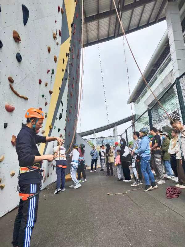 讲座后,韦老师带领同学们来到攀岩教学场地进行攀岩体验,活动过程中,同学们利用刚刚所学的知识有序地进行了攀岩训练,韦老师为体验者们提供了安全、专业、规范的攀岩技术指导。