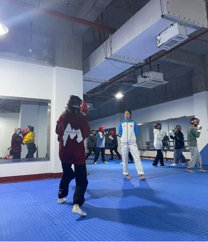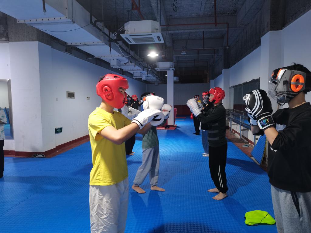 讲座后,袁老师带领学生来到了训练馆进行武术散打体验活动,对训练内容做了系统的安排,亲自示范攻防技术。同学们进行了拳法与摔法、腿法与摔法的练习,把武术的相生相克、三盘、四击技击理论运用到实践当中。