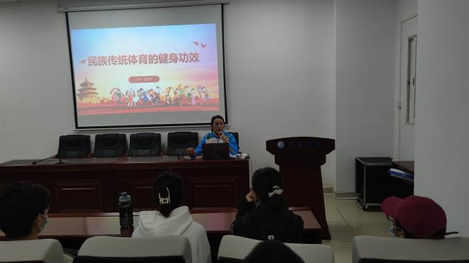 为弘扬民族传统体育运动,建立终身体育锻炼习惯,培养学生文化自信和文化知觉的观念。11261430体育学院袁雪涛老师在云塘体育馆A306举办“民族传统体育的健身功效”主题知识讲座。本次讲座特别邀请了武术协会会长于铠荣、跆拳道协会会长张炎两位同学,与校内武术爱好者四十余人参加本次讲座。