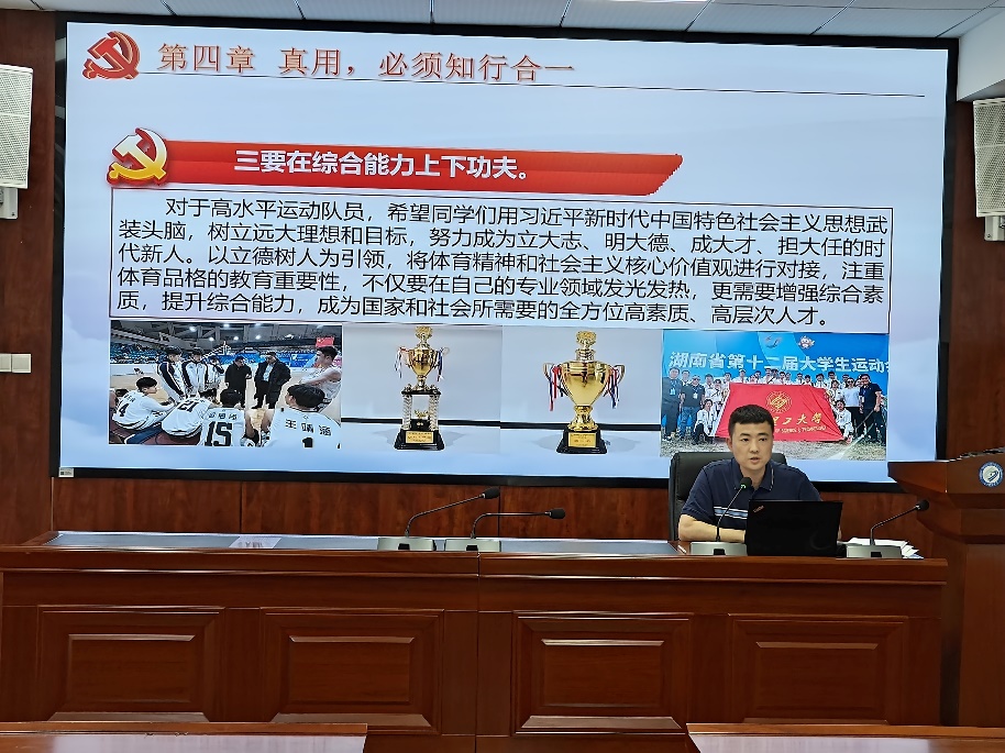 刘勇则在报告厅为球类运动党支部党员及高水平运动队做了题为“学深悟透、知行合一,落实'以体育人'”的党课讲座。特别强调针对现阶段主题教育的学习,党员务必要真学、真懂、真信、真用。对于高水平运动员,希望同学们树立远大理想和目标,不仅在专业领域发光发热,更需要提升综合能力,成为高素质人才。