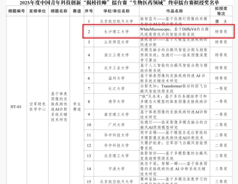 在近日落幕的2025年度中国青年科技创新“揭榜挂帅”擂台赛中,我院王新、王威老师带领的学生团队凭借“WhiteMicroscope:基于DiffuVit的白癜风进展情况识别智能诊断系统”,在清华大学、华中科技大学等全国顶尖高校组成的279支队伍中脱颖而出,成功斩获“生物医药领域”主擂台赛特等奖,这也是开云官网首次获得挑战杯“揭榜挂帅”赛道特等奖,以实际成果展现了学校创新人才培养的扎实成效。