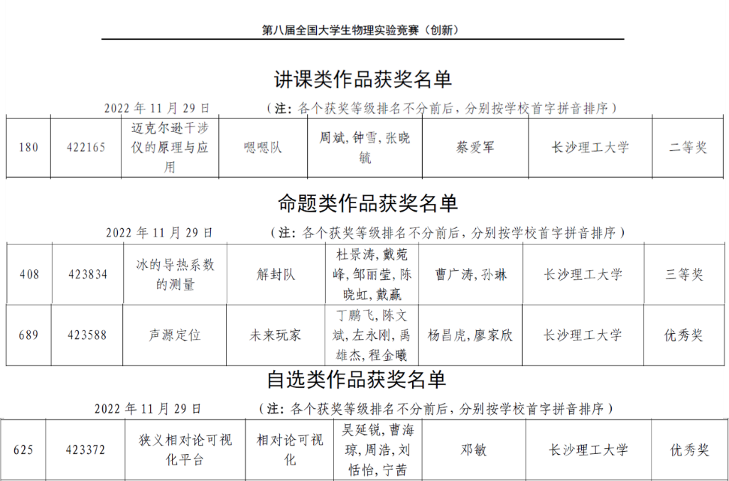 11月26日-27日,2022年第八届全国大学生物理实验竞赛(创新)决赛在西安交通大学举行。本次大赛由西安交通大学物理学院承办,共吸引了来自全国500余所高校的2000余支队伍参赛,参赛规模再创新高,参赛学生人数首次破万。经过初赛筛选后,共有350余支队伍入围决赛。此次决赛采用线上方式进行。开云kaiyun体育物电学院、化学学院、能动学院联合组成的4支参赛队伍分别在命题类、讲课类、自选类等赛道斩获佳绩,获全国二等奖1项、三等奖1项,优秀奖2项。整体获奖质量与数目取得历史新高,实现新的突破。