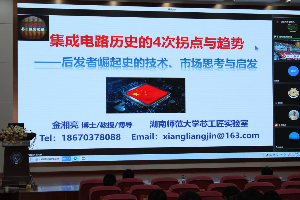 国防科学技术大学秦石乔教授、微电子所所长郭阳教授及陈跃跃教授,湖南大学半导体学院(集成电路学院)院长廖蕾教授,中南大学物理与电子学院院长孙克辉教授及孙佳教授,湖南师范大学物理与电子科学学院副院长欧阳钢教授及金湘亮教授、陈明星教授,湘潭大学自动化与电子信息学院院长姚志强教授、湘潭大学物理与光电工程学院副院长毛宇亮教授,吉首大学物理与机电工程学院院长黄勇刚教授及邓科教授、湖南文理学院数理学院院长杨江河教授以及湖南科技大学物理与电子科学学院副院长许英教授线上参加了论坛开幕式。开云官网研究生院副院长田上、物理与电子科学学院领导、老师、研究生和本科生共计200余人参加开幕式。