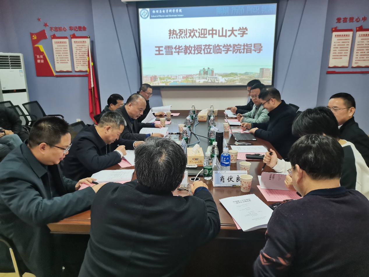 报告结束后,学校副校长胡永乐亲切会见了王雪华教授并一同参加了学院有关学科建设座谈会。会上,胡永乐副校长感谢王教授对物电学院学科建设的关心与指导,并就学校为如何加强基础研究、增加对电子科学与技术和物理学科建设投入等情况与王教授进行了讨论交流。张卫兵副院长介绍了我院近年来学科建设情况。王雪华教授在听取学院学科建设情况后,充分肯定了学院取得的成绩并提出了许多针对性建议。同时参加座谈的还有研究生院副院长(主持工作)何忠明、研究生院原院长管德清、学院领导班子及学科带头人、学术骨干20余人。