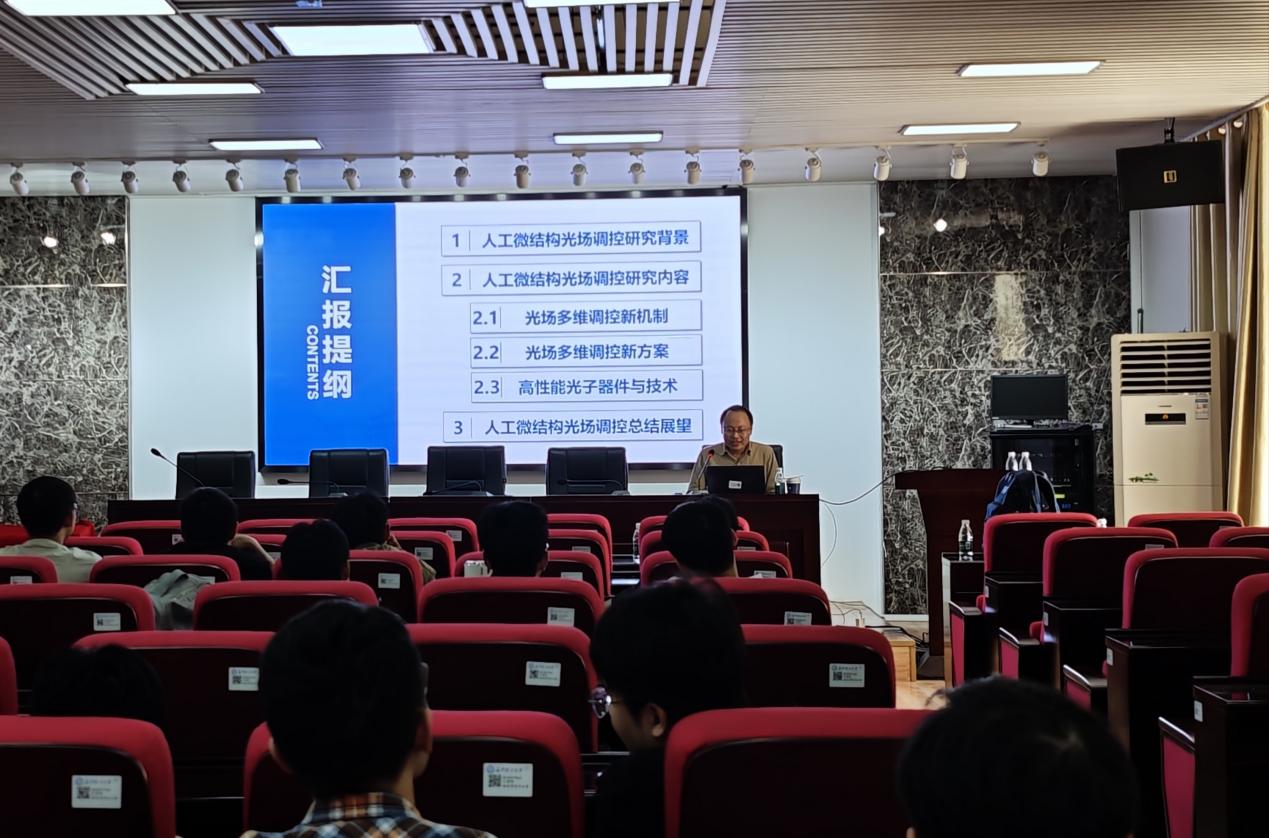 2025年4月25日下午,南开大学陈树琪教授应邀来开云官网交流指导,在理科楼B413会议室作了题为《人工微结构光场多维调控物理及应用》的学术报告。我院师生积极参加了此次学术报告会,会议由邓科教授主持。